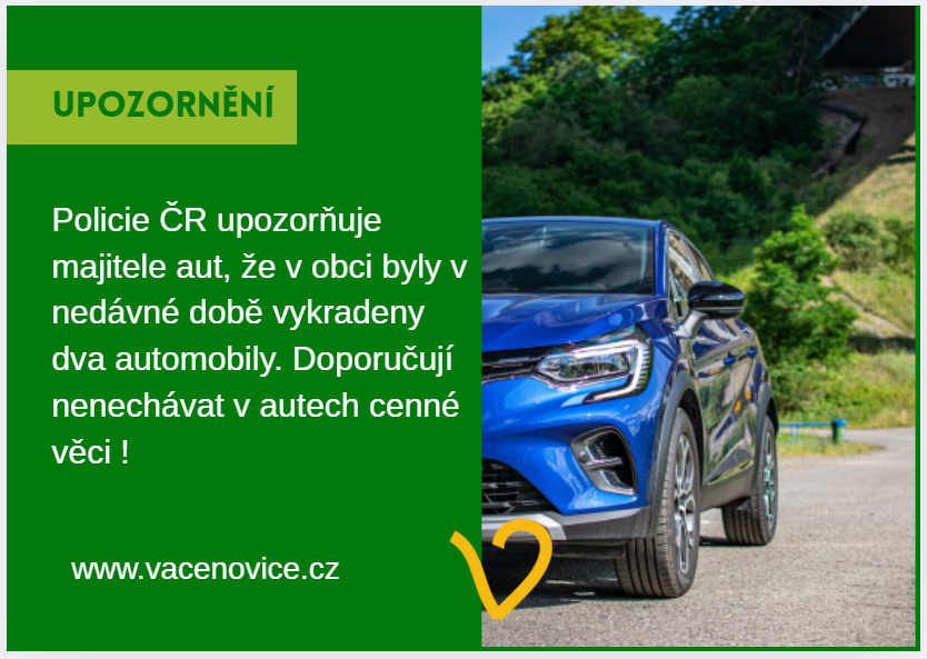 V nedávné době byly v obci vykradena auta, policie vyzývá občany, aby nenechávali cenné věci v automobilech a pokud je to možné umístili do garáže, nebo na dvůr.