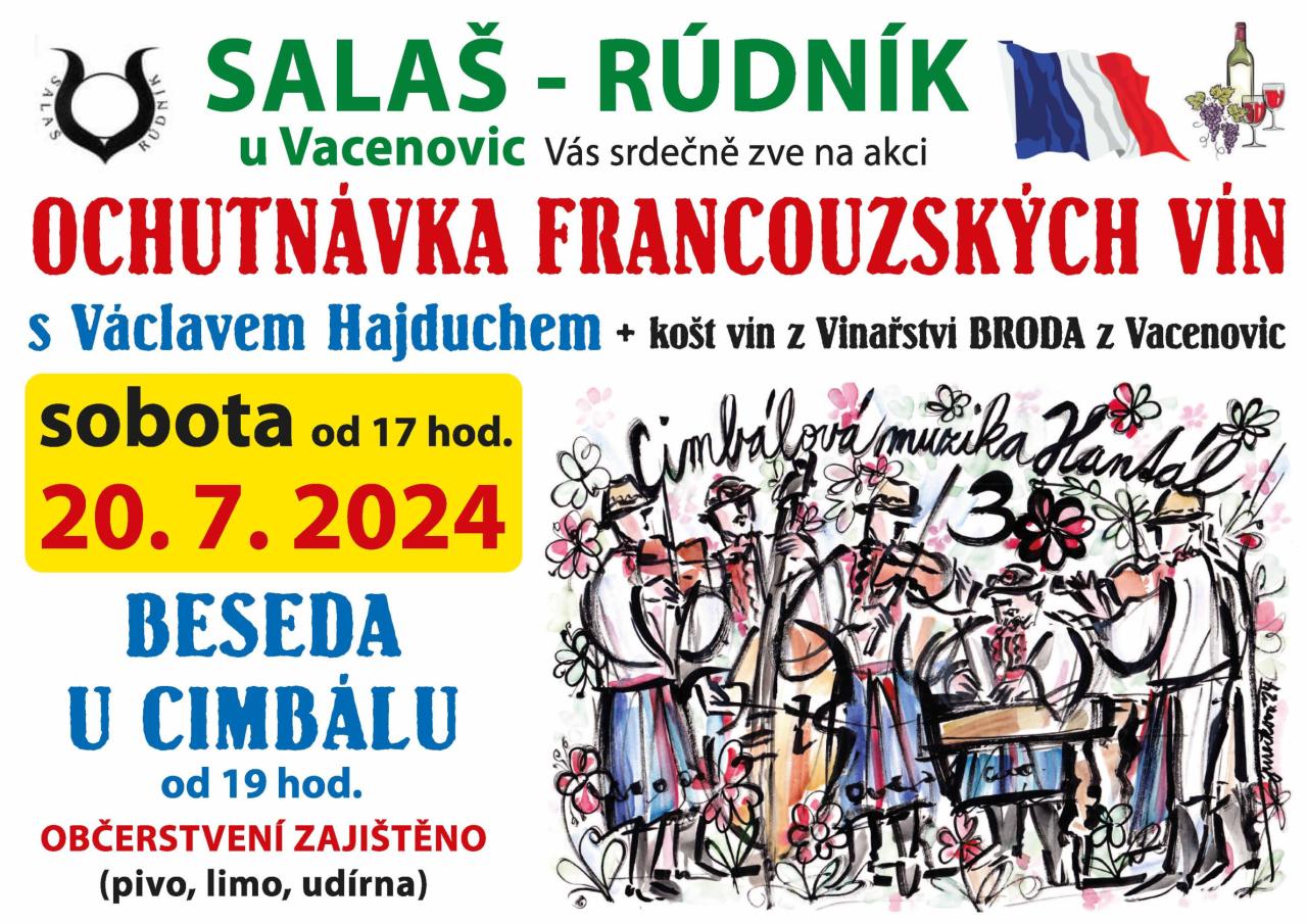 Ochutnávka francouzských vín s p. V. Hajduchem a vín z místního vinařství Broda za doprovodu CM Hantál v krásném prostředí rúdnické salaše.